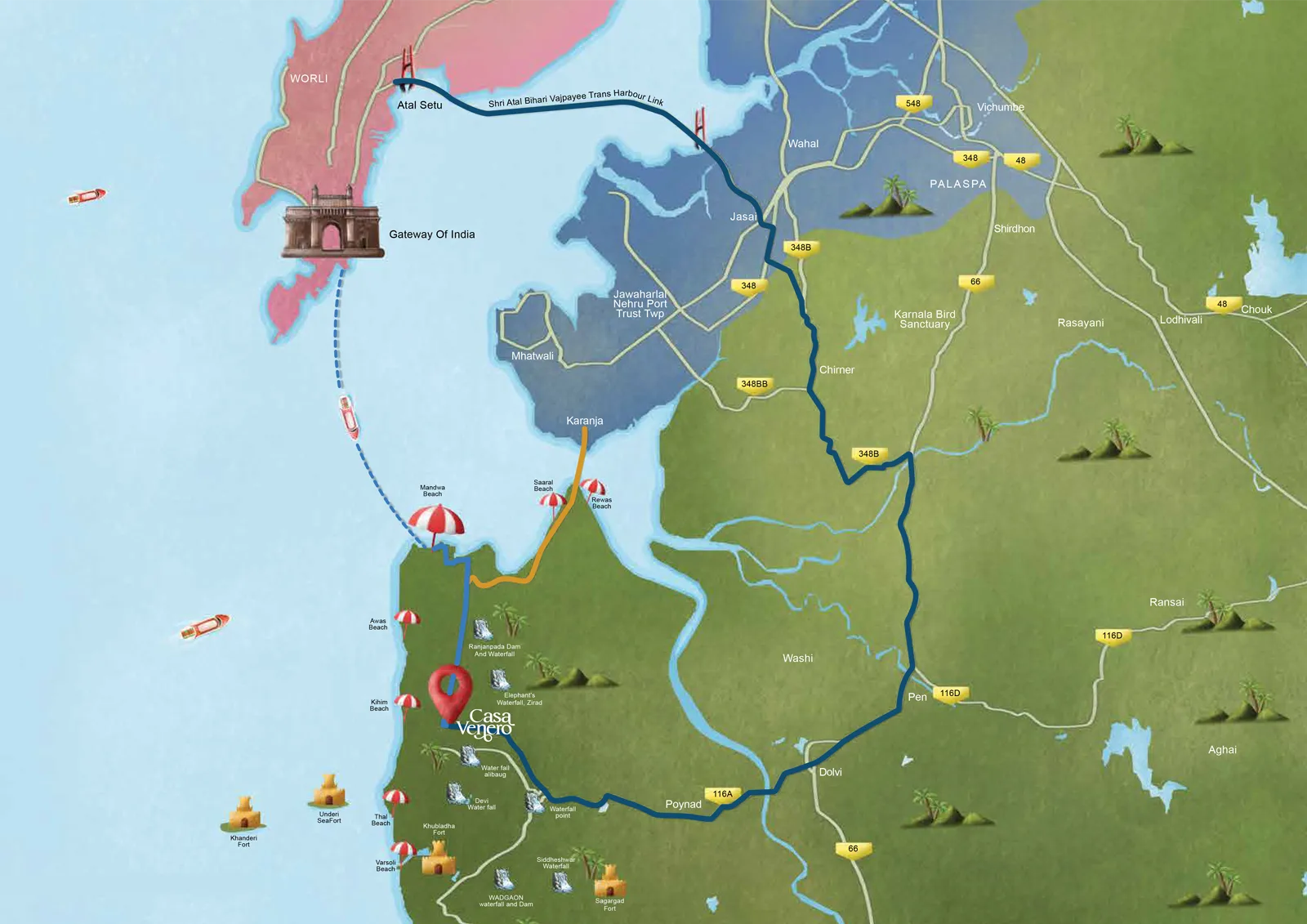Living at Emaar Casa Venero Alibag lets you enjoy a relaxed coastal lifestyle. Getting to Alibag from Mumbai is now more accessible with the new Atal Setu bridge, which makes it quickly accessible. You can also drive to Mandwa and take a beautiful ferry ride to reach this coastal spot.