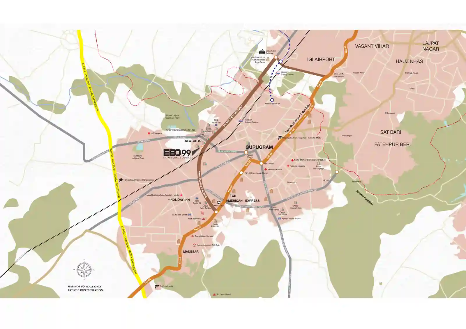 Emaar EBD 99 is located on the 150-meter-wide Dwarka Expressway, one of the key roads in Gurugram. This expressway is part of the 27.6 km Northern Peripheral Road, built to reduce traffic and connect Delhi and Gurgaon easily. With over 2 lakh vehicles using this road daily, it guarantees high visibility and many people passing by.