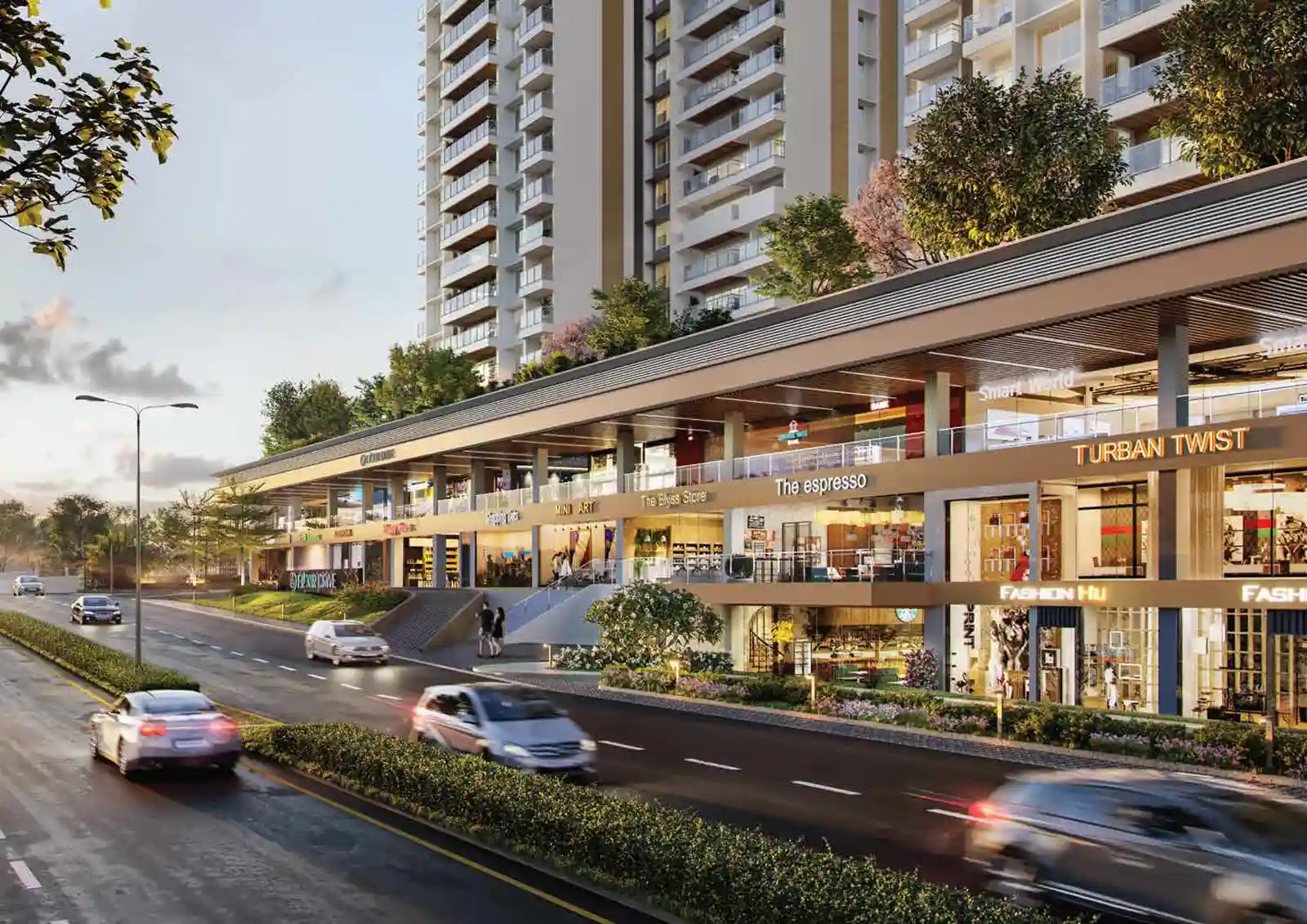 ✔ Tree-lined boulevard in front of high-street shops
